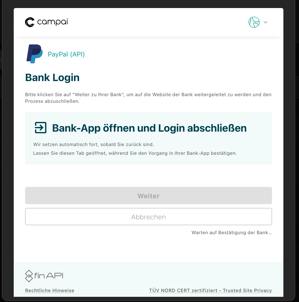 Finapi öffnet sich und leitet nach Paypal weiter. (ggf. Geschäftsbedingungen erst akzeptieren)