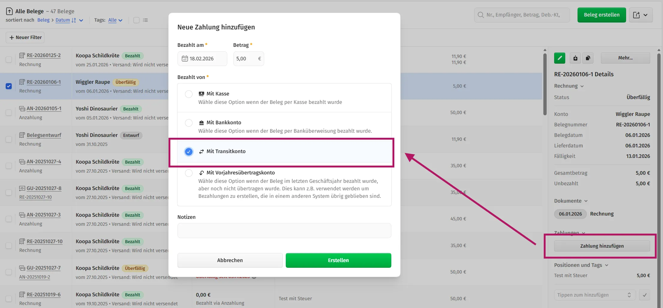 Sorry, hab das falsch nachgestellt, mit unterzahlung statt überzahlung. Aktuell würd ich dann eine Anzahlung über den zuviel bezahkten Betrag erstellen und dann (unabhängig )unter Belege → beleg erstellen eine Gutschrift und die dann mit der rücküberweisung verknüpfen oder gleich aus campai überweisen.