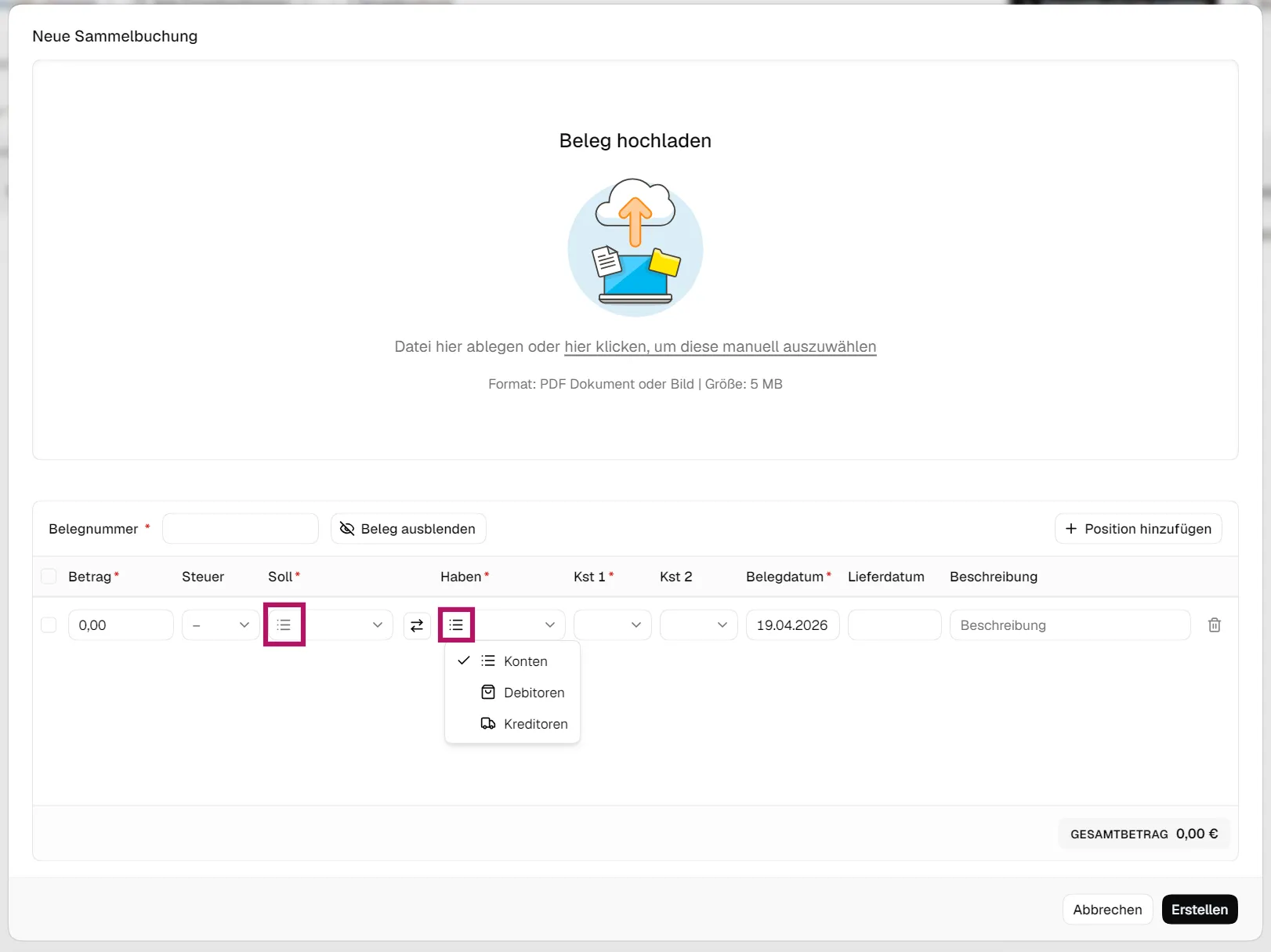 Um bei der Sammelbuchung Kreditoren anzugeben, musst du auf das Listen-Symbol klicken und kannst dann zwischen Sach-, Kreditoren- und Debitorenkonten wählen: