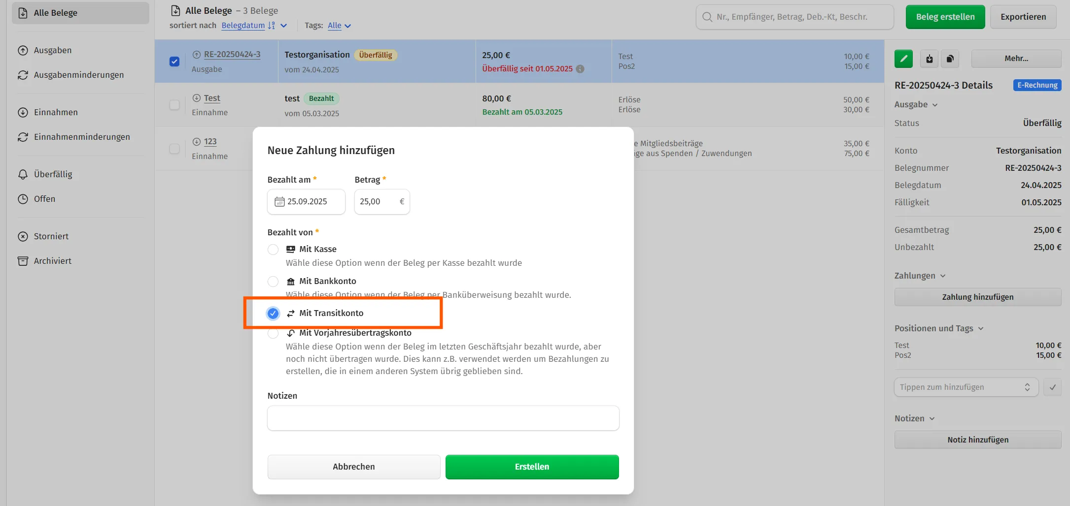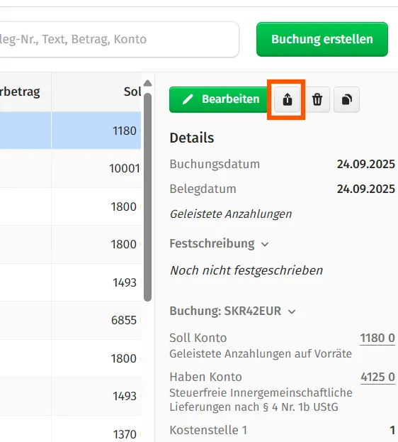 Wir haben über "Buchungen" versucht, den Kostenvorschuss von Konto 3695 an Konto 6663 Reise/-Fahrtkosten zu buchen. Dies war zwar erfolgreich, aber wir konnten die Belege nicht in gewohnter Weise anhängen. Es gibt zwar die Möglichkeit nach der Buchung Belege hochzuladen, die werden uns aber nicht in der üblichen Weise mit der Buchung angezeigt.