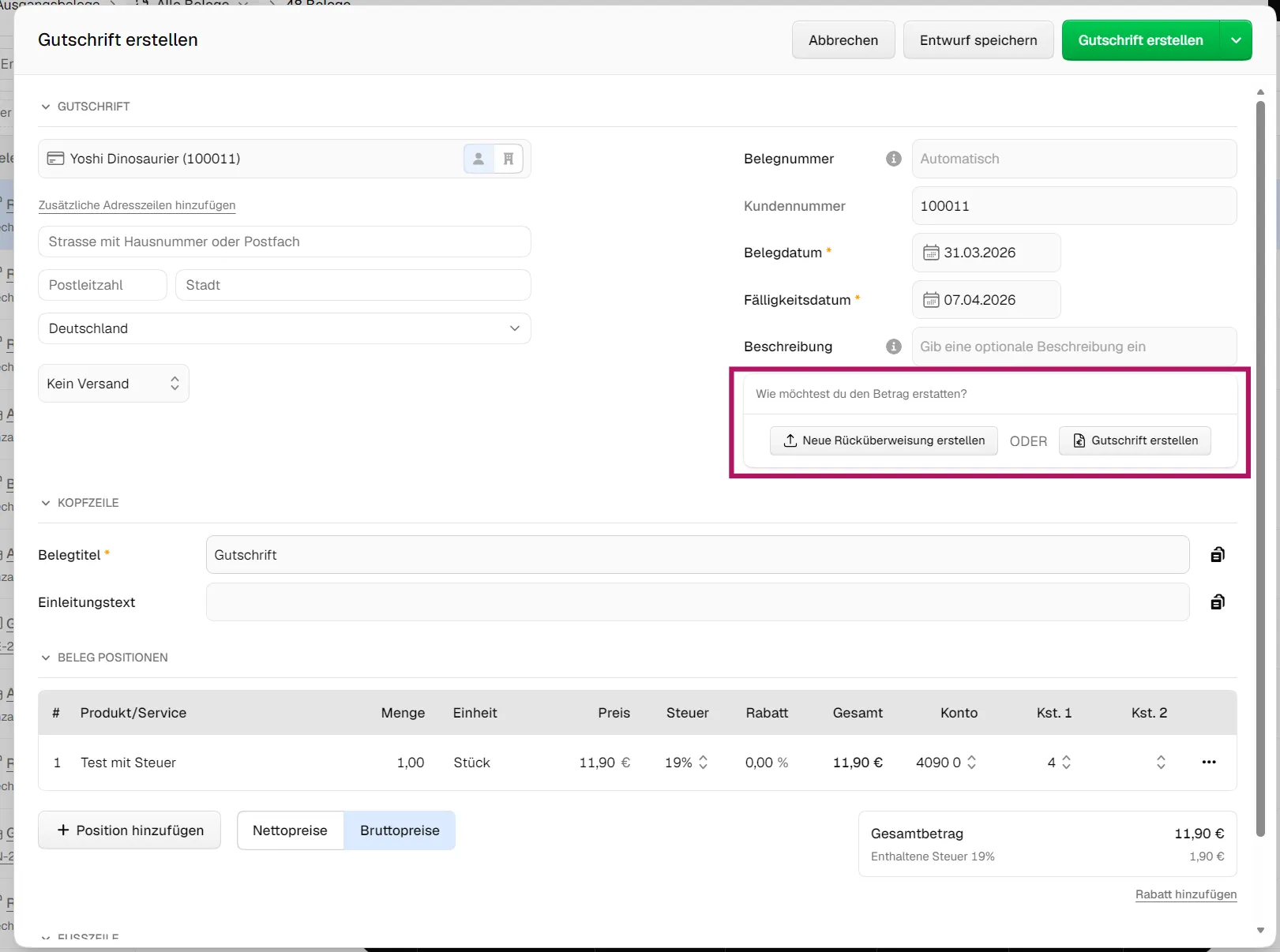 Wenn du das Guthaben aktuell schon hast, erstelle bitte eine Anzahlungsrechnung dafür, weise die Zahlung der Anzahlungsrechnung zu und klicke dann auf "Beleg erstatten". Dann kannst du die Rücküberweisung erstellen.