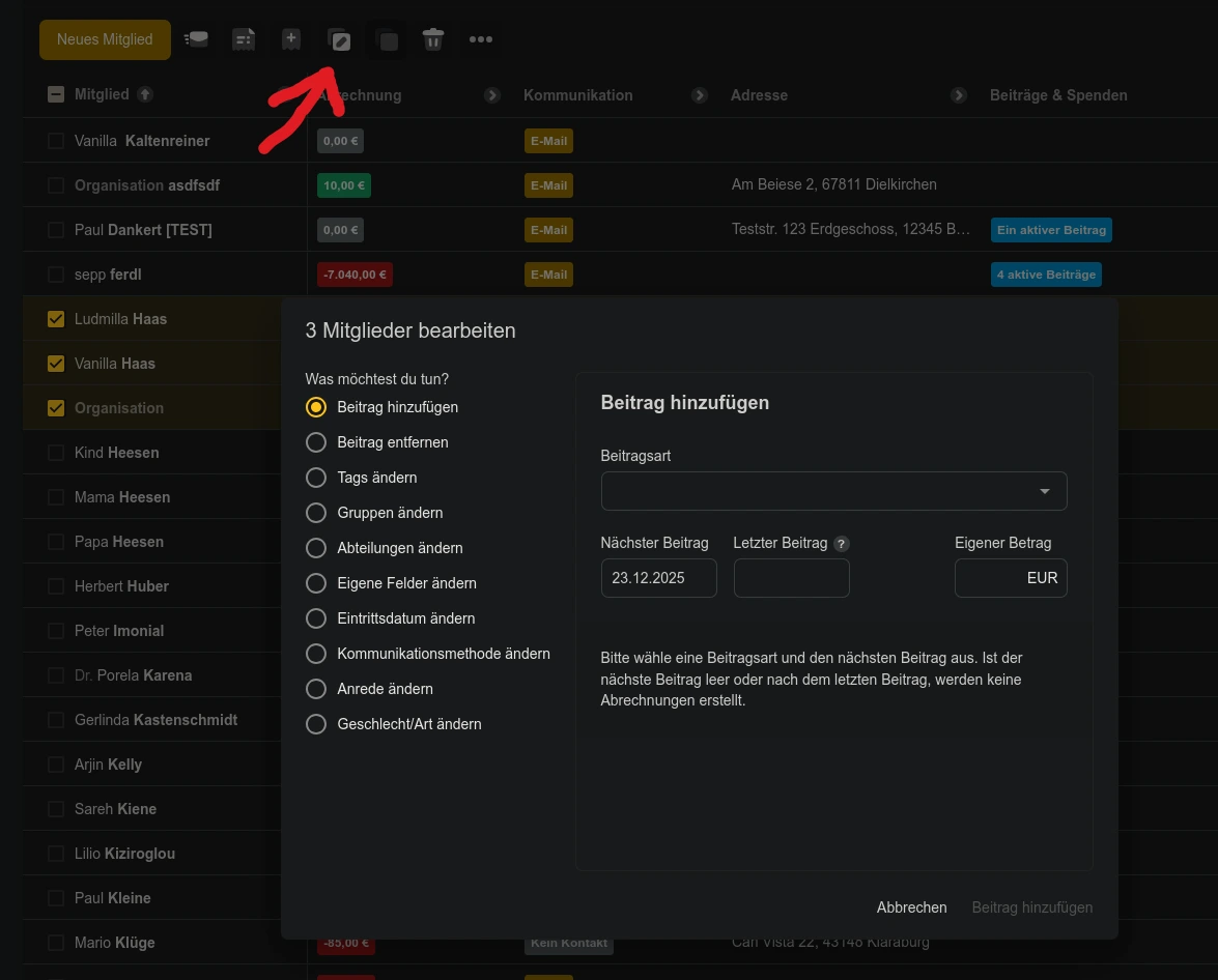 Dann würde die Beitragsart 2025 auslaufen und ab Neujahr die – beispielweise über die Funktion "Massenbearbeitung/Beiträge zuweisen" hinzugefügte – Beitragsart 2026 gelten. Einzelfälle könnte man dann weiterhin über die Einzelansicht anpassen.