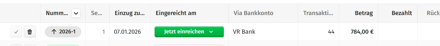 Die Lastschriften sind unter Lastschriften zu sehen. Wenn man den Reiter einreichen betätigt kommt eine Meldung mit internen Serverfehler und das man sich an den support wenden soll. Der sagt nun ich müsste meine Kontodaten aktualisieren Allerdings nutze ich das konnte wöchentlich.
