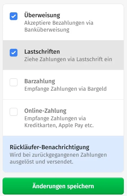 Nun kann ich bei den Debitoren auswählen, ob Überweisung oder Lastschrift gewählt wird.