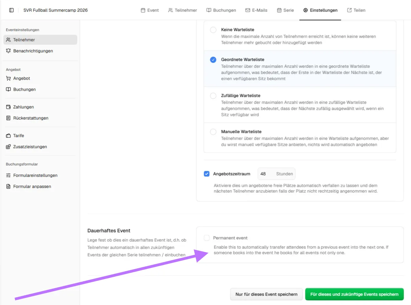 ich habe den Überblick verloren 🙈. Ist es bereits umgesetzt, dass die Teilnehmer von Dauerevents sofort in alle Termine eingebucht werden? Bislang erfolgt das noch nicht. Muss ich eine Einstellung ändern? 168 Stunden kann man übrigens leider nicht eingeben.