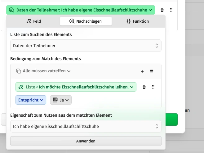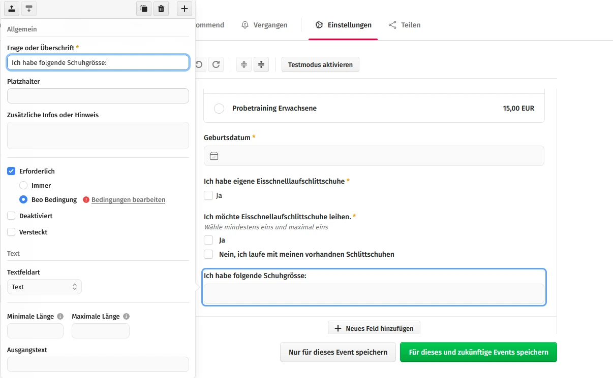 Ich möchte, dass man die Frage nach der Grösse der zu leihenden Schlittschuhe angezeigt bekommt und beantworten muss, wenn die Frage "Ich möchte Eisschnelllaufschlittschuhe" leihen mit "Ja beantwortet wurde.