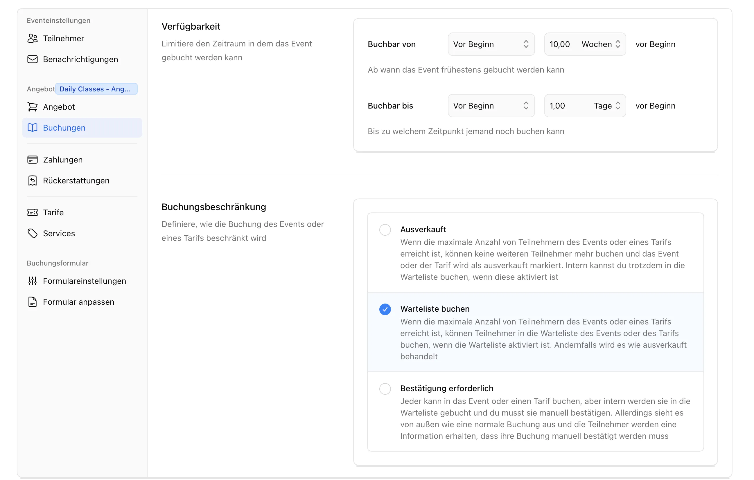 Guten Morgen, wir haben im Verein bei uns diverse Dauerevents (Kurse) bei denen es wichtig ist, dass die Mitglieder erst 1-2 Wochen vorher den Kurs buchen können. Andernfalls wären unseren beliebtesten Kurse auf Monate sofort ausgebucht.