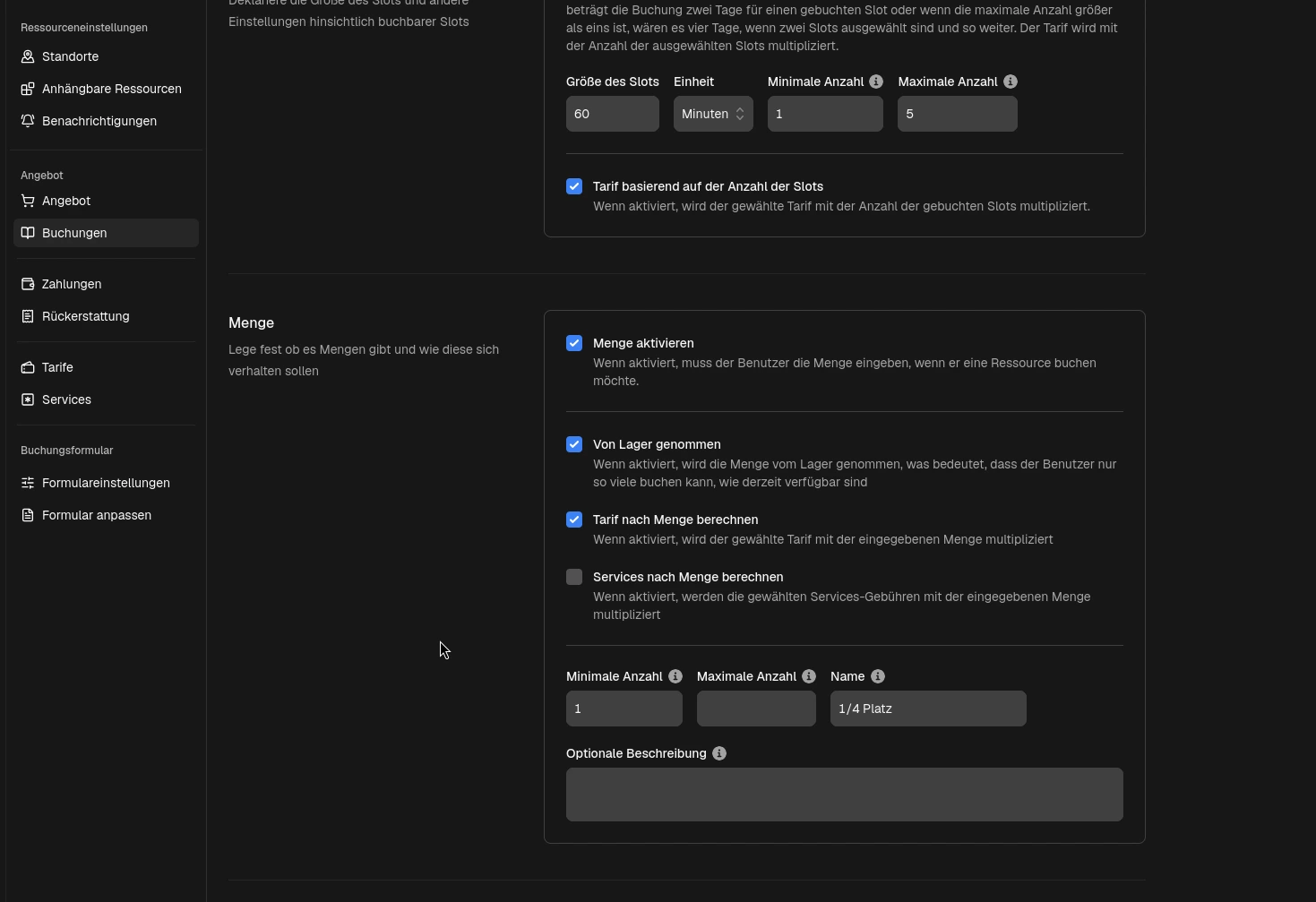 du kannst bei der Ressource unter Einstellungen im Menüpunkt "Standorte" den Lagerbestand auf 4 setzen. Dann kann man den Platz zu jedem Slot 4mal buchen wobei eine Buchung für 1/4 Platz stünde.
