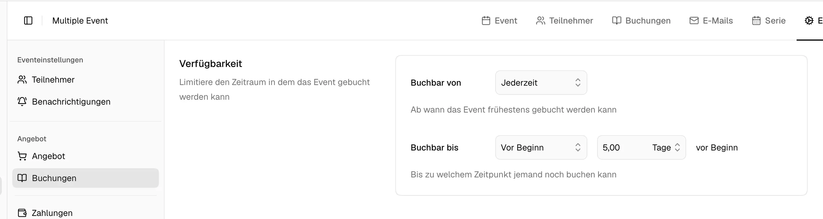aufgrund von Personalplanung bräuchten wir 5 Tage Vorlauf, nachdem eine Buchung für einen Kurs eingegangen ist. Wir finden leider die passende Einstellung nicht, um Termin maximal 5 Tage vor Start buchbar zu machen.