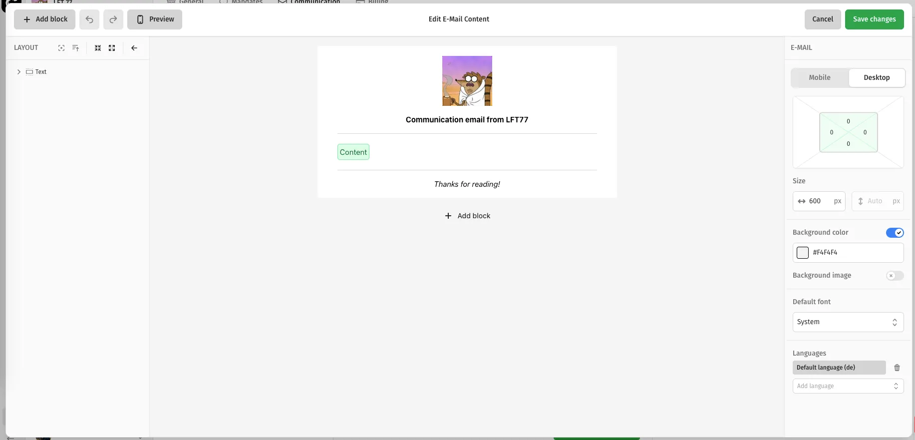 - Schön wäre auch die Möglichkeit, ein/das Logo der Orga einzufügen, damit die Mail offizieller aussieht