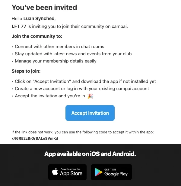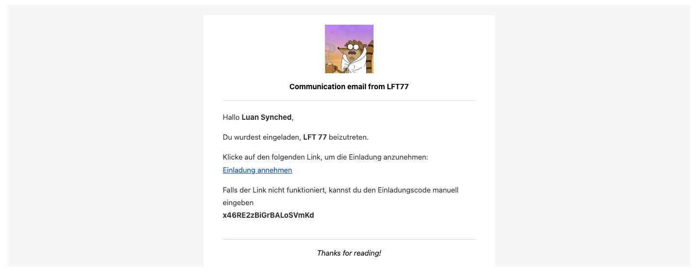 Wunsch: Möglichkeit, den gesamten Text individuell anzupassen. Alternativ: Option, den Versand der Einladungsemail komplett zu deaktivieren, damit wir diesen Schritt in unsere eigene Kommunikationskette integrieren können - beispielsweise schon in der E-Mail, die über die Aufnahme in den Verein informiert.