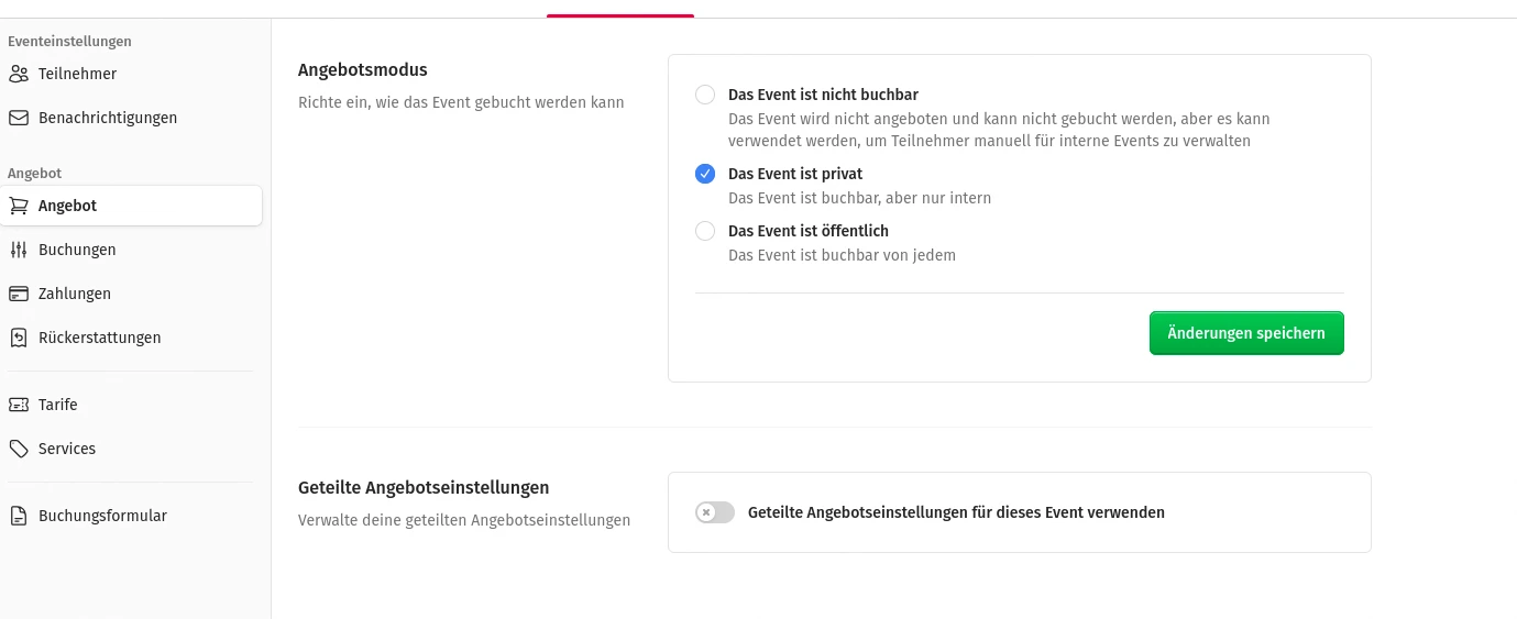 Gegebenenfalls kannst du noch einen Tarif hinzufügen, wenn der Preis in der Übersicht angezeigt werden soll. In der App kann man das leider nicht ausblenden und es steht kostenlos, falls kein Tarif hinterlegt wurde. In der Webansicht dann öffentlich und privat auswählen beim Angebotsmodi.