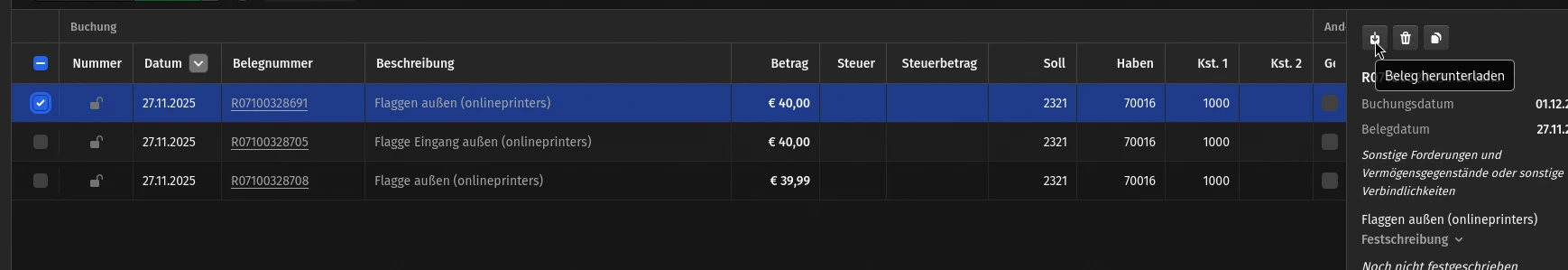 Du kannst es auch wenn du eine Buchung auswählst wenn in der Siedbar der Downloadbutton ist: