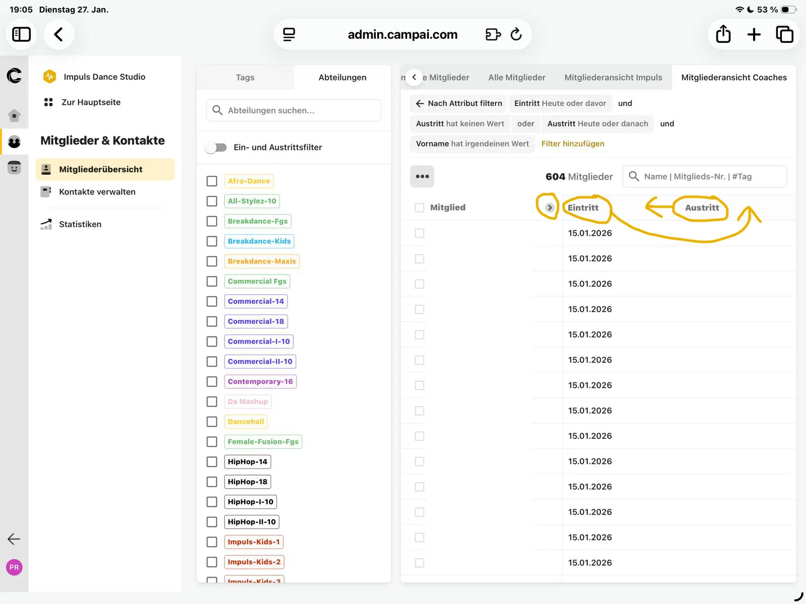 Konkret in unserem Fall wollten wir für unsere Coaches, die nur eine beschränkte Lese-Rolle haben, eine Mitglieder-Liste mit wenigen Daten (Name, Alter, Eintrittsdatum, Kurs) erstellen. Leider versteckt sich das Alter hinter dem kleinen Pfeil (siehe Screenshot), den man in der beschränkten Rolle nicht aufklappen kann, und die anderen Spalten, die sichtbar sind, lassen sich in der Reihenfolge auch nicht verschieben.