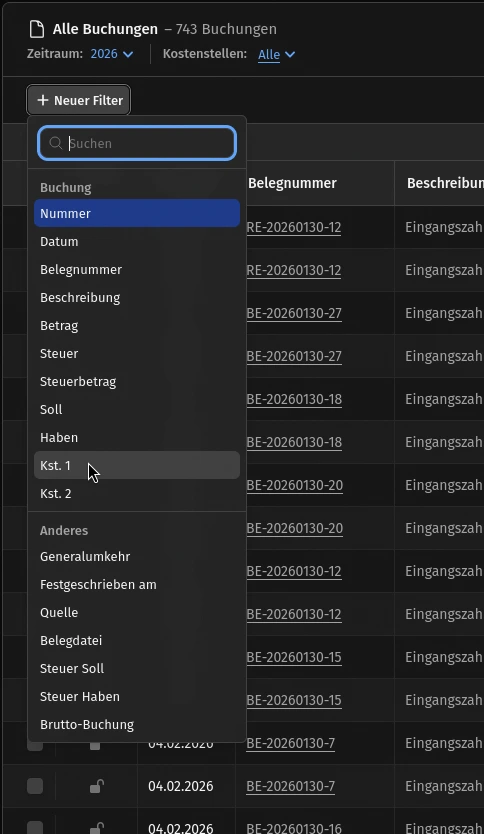 Kostenstellen kannst du bei Belegen neu zuordnen. Die kannst du auch genauso nach Kostenstellen filtern.