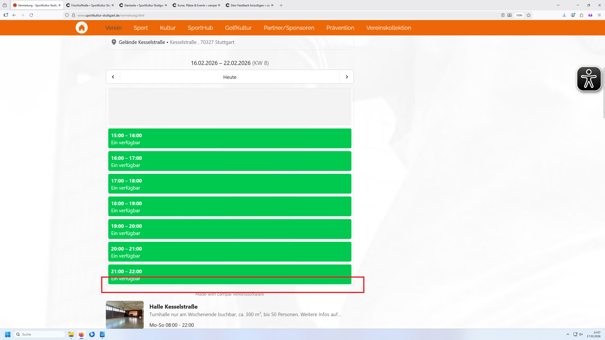 Wir haben die Buchung unserer Hallen etc. auf unserer Homepage verlinkt (Ressourcen und Plätze). Die Buchung vom aktuellen Tag ist leicht zu finden, ebenso von Terminen jeweils eine Woche später. Zum Finden von Tagen dazwischen erscheint unten eine Schiebeleiste, die man aber nur findet, wenn man über diese Bescheid weiß. Gibt es eine Möglichkeit diese etwas offensichtlicher darzustellen?