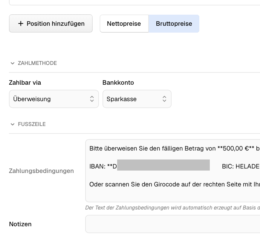 Es wäre sehr hilfreich, wenn man den Zahlungsbedingungen-Text beim Erstellen einer Rechnung (für diese) ändern könnte.