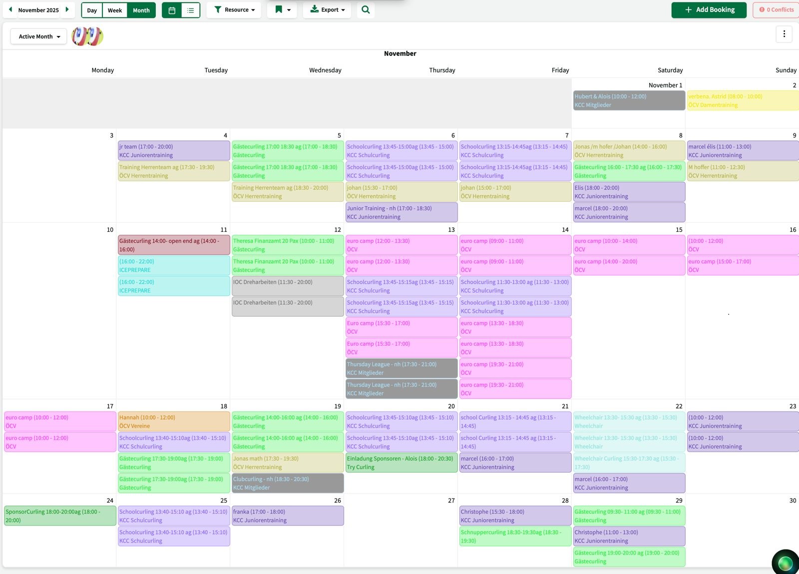 ich kann dir gerne einen Screenshot schicken - so hat es Locaboo gelöst. ein Monatskalender pro Tag ein Feld - da waren dann alle Reservierungen/Buchungen aufgelistet - wenn man mit der Maus auf den Eintrag gegangen ist - hat man die Details gesehen und auch den Rink (Ressource) - wenn zeitgleich Einträge waren, war es klar das beide Ressourcen vergeben waren. Aber auch auf Campai - wenn ich auf Webansicht gehe habe ich ja schon beide Ressourcen auf einen Schirm - vielleicht kann man auch die weiterentwickeln. Hoffe das hilft - für uns wäre das eine großartige Erleichterung. lg Alois