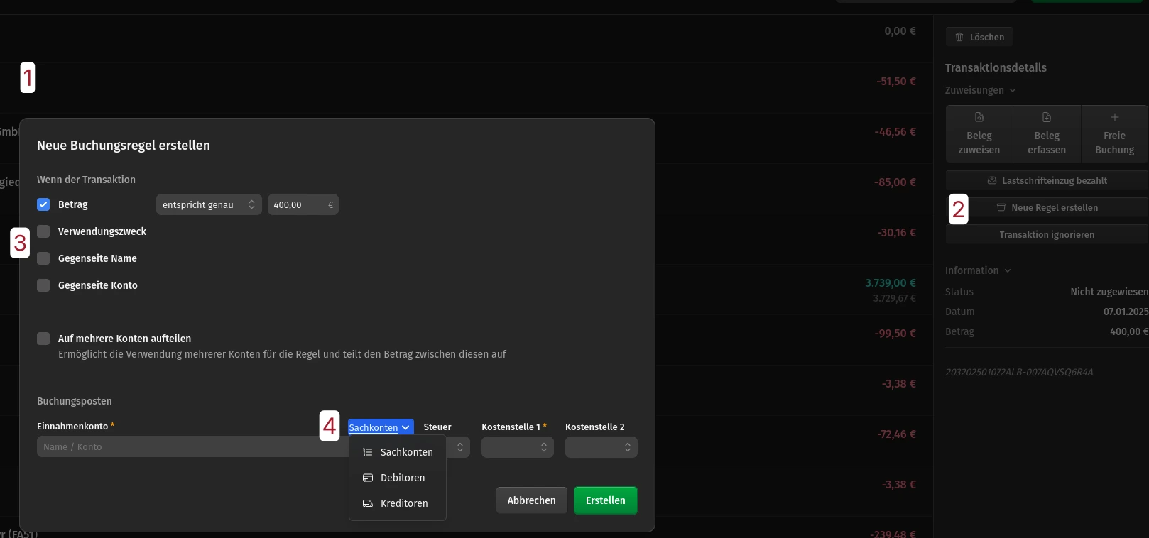 Telekom-Rechnung von jedem Monat. Telekom ist als Kreditor angelegt. Eine Buchungsregel haben wir auch, mit den entsprechenden Kriterien sowie unseren Details für Buchungsposten wie Kostenstelle, Buchungskonto, Steuer angelegt. Jedoch fehlt hier die Auswahl des Kreditors (oder Debitors bei Einnahmen).
